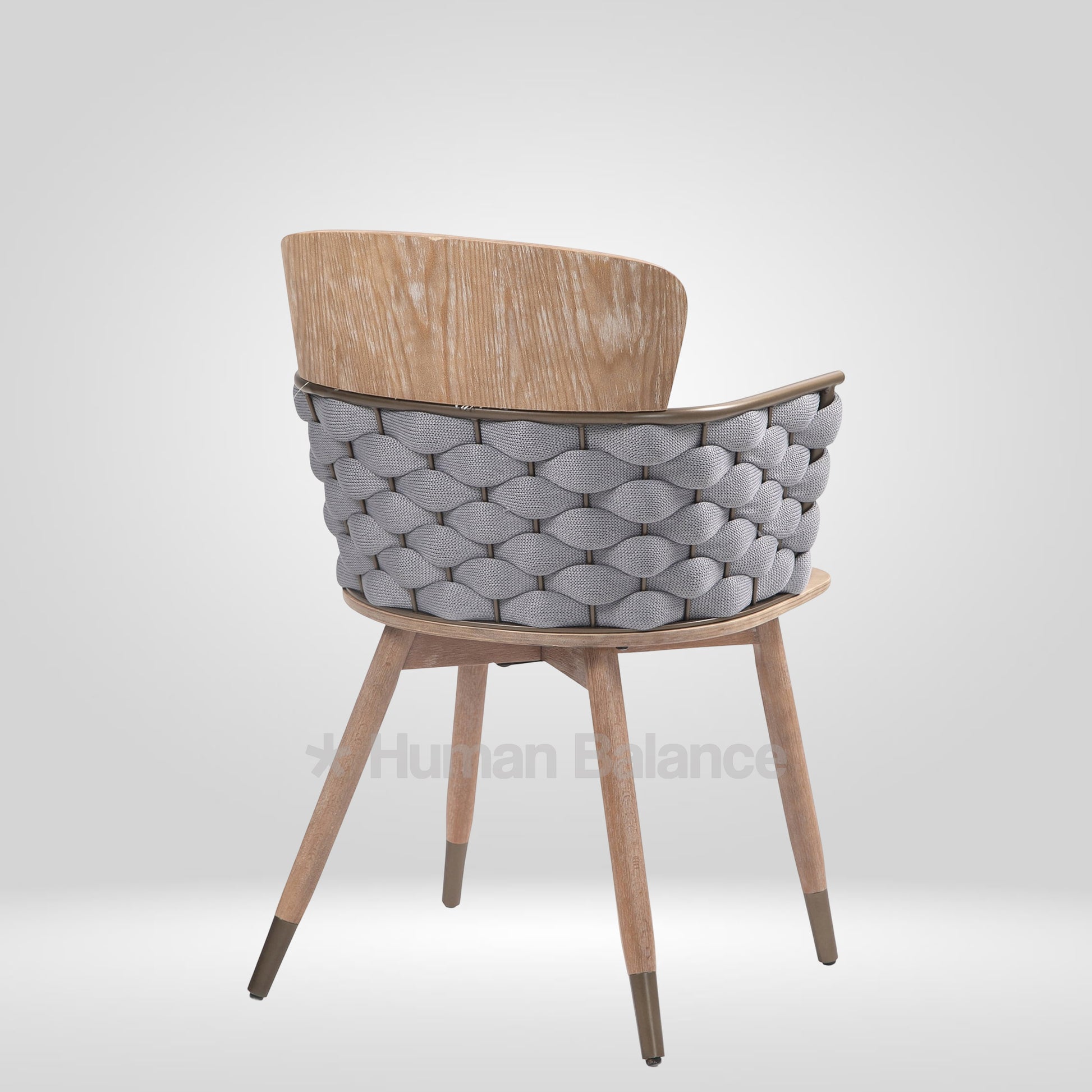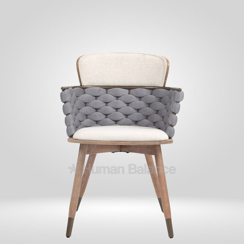 The backrest of the Akasa cafe chair depicts a unique plaited weave design making it stand out. It adds an artistic flair without taking over the room. In addition to looking fashionable, this design gives the back a cozy texture that subtly supports the user. The tapering legs with bronze caps induce an organic midcenturian aura into the space making it a visually appealing piece.