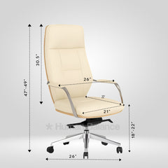 The sleek profile of the Benedict chair depicts modern executive aesthetics and smooth planar transitions. The fluid silhouette showcases an appealing architectural flow that displays distinct linearity and elegant authority. Its double tone palette visually splits the interior seating shell from the exterior rear providing the chair a crisp look. The handles have a subtle taper giving the profile a structured and neat look, an inspiration from modern European office design.