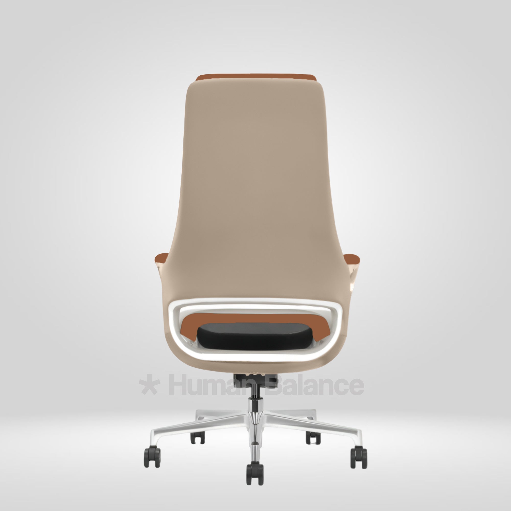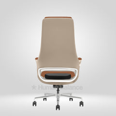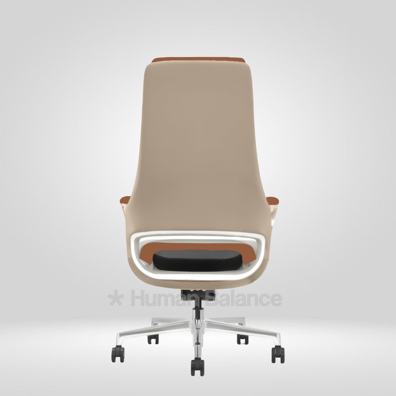 The backrest features a faux leather wrapped back exterior that enhances the chair’s premium character. The subtle cut out element at the lower back adds a distinctive design detail while visually reducing bulk.