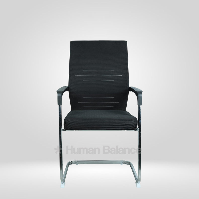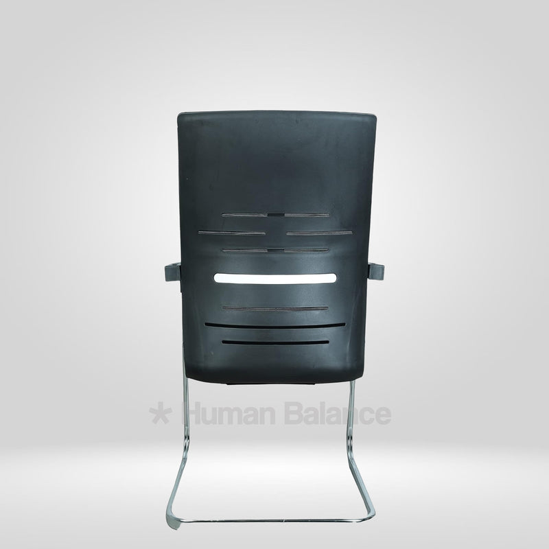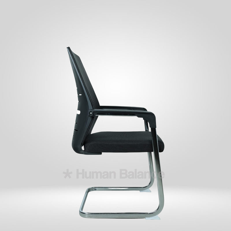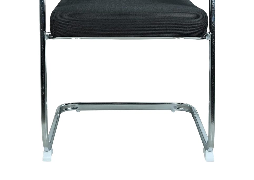 The frame uses a linear cantilever arrangement where the seat projects ahead of the base forming a streamlined stance that improves leg space and visual clarity.