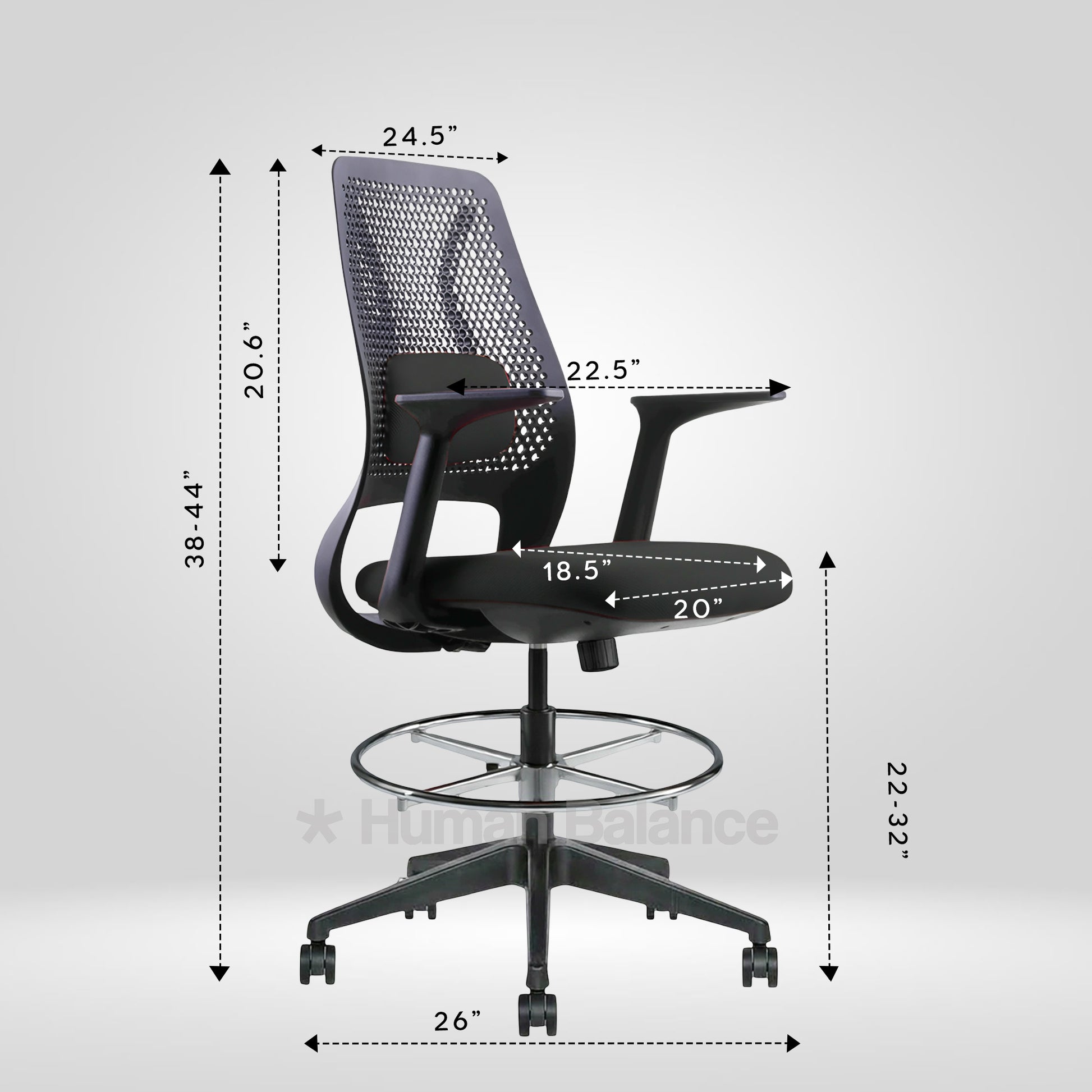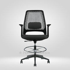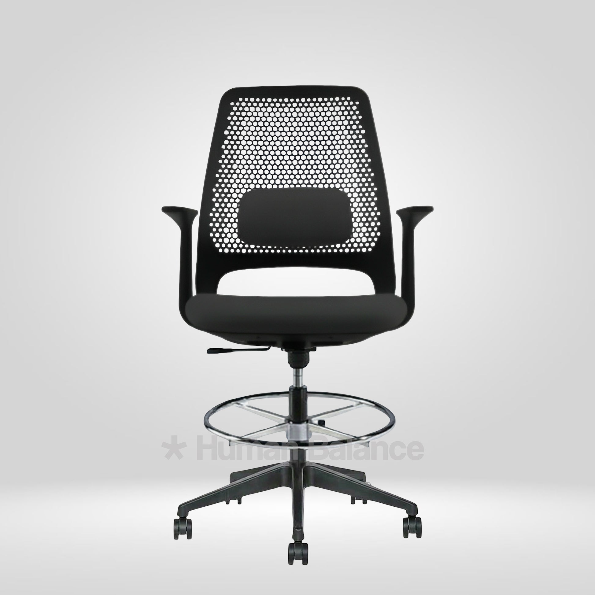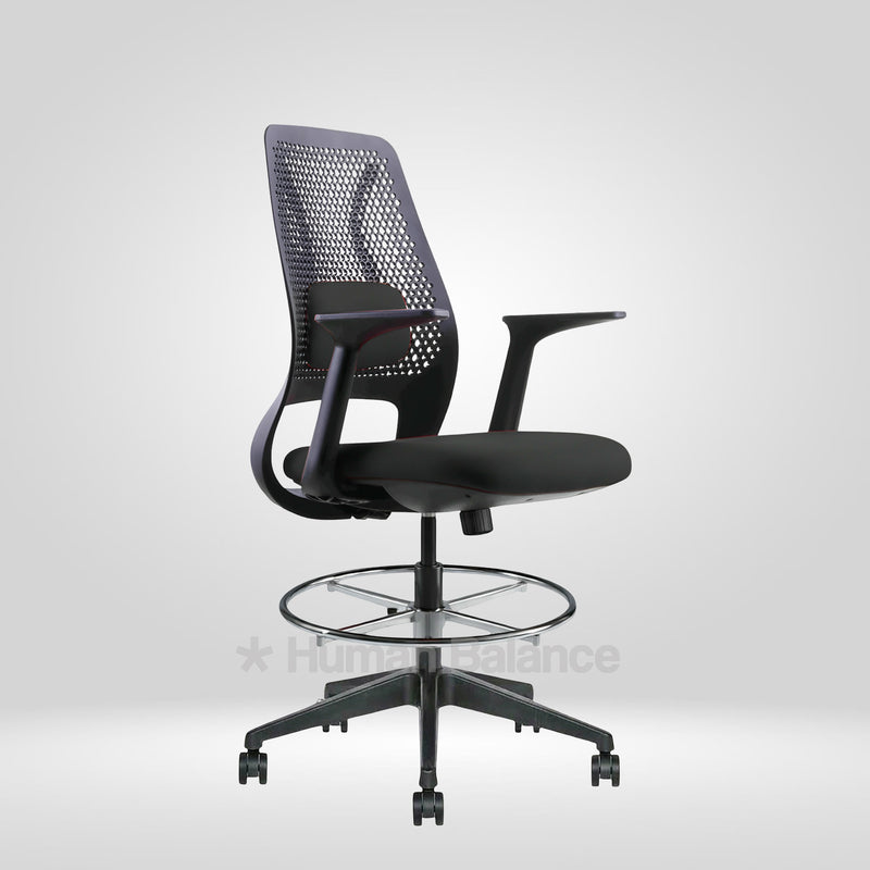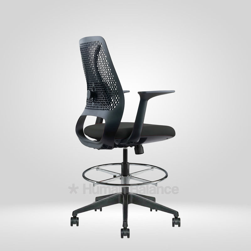 The Hexacomb lab chair stands out with it's unique perforated backrest. Such iconic structure embodies a honeycomb inspired pattern which gives the chair a technical and an artistic look. The geometric perforations help to improve airflow which is beneficial for active lab spaces. The bold black frame gives a neat and precise shape to the design. A lumbar pad is placed within the perforated back to support the lower back while the footrest ring gives the feet a steady place to rest. This makes the chair a great fit for modern innovation driven workspaces.