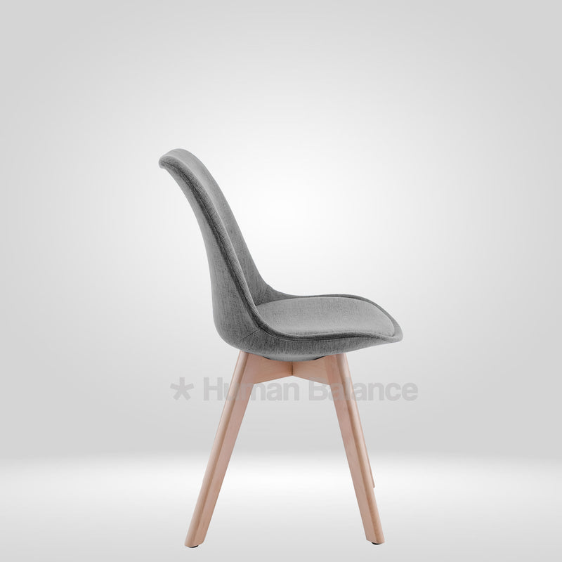 This modern chair is a sleek and practical touch to any contemporary room. Built with high quality single moulded fibre body which combines durability with ergonomic support, the seat is comfortably cushioned and upholstered with a soft fibre fabric offering just the right support for comfortable seating of long periods. This chair adds comfort and sophistication to everyday use. The base is made from solid wood legs in natural finish. A perfect combination of comfort, strength, and style in one compact form. Not only are these strong legs going to last forever, they also provide an excellent contrast against the smooth seat making the chair look stable and well rounded. The angle cut of the legs is inspired by mid century looks exuding a Scandinavian vibe. This chair, available in a variety of beautiful shades is perfect for a range of interiors like warm café nooks, restaurants, diners and lounges. The seat height of the chair is 18 inches ideal for 30 inch tabletops.