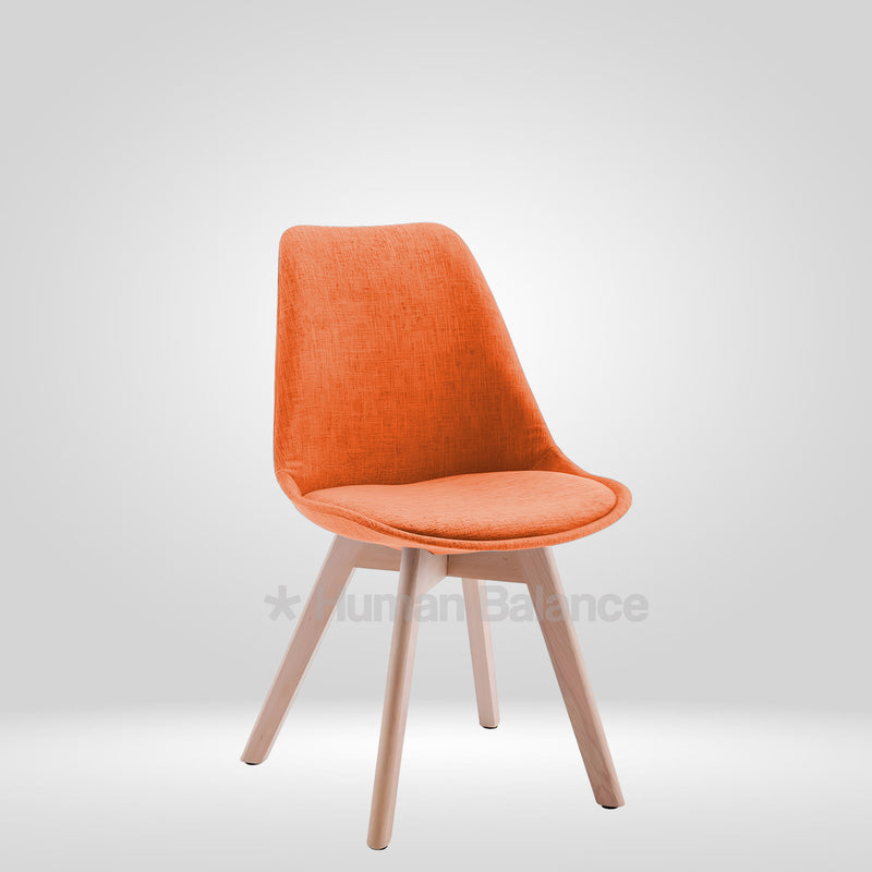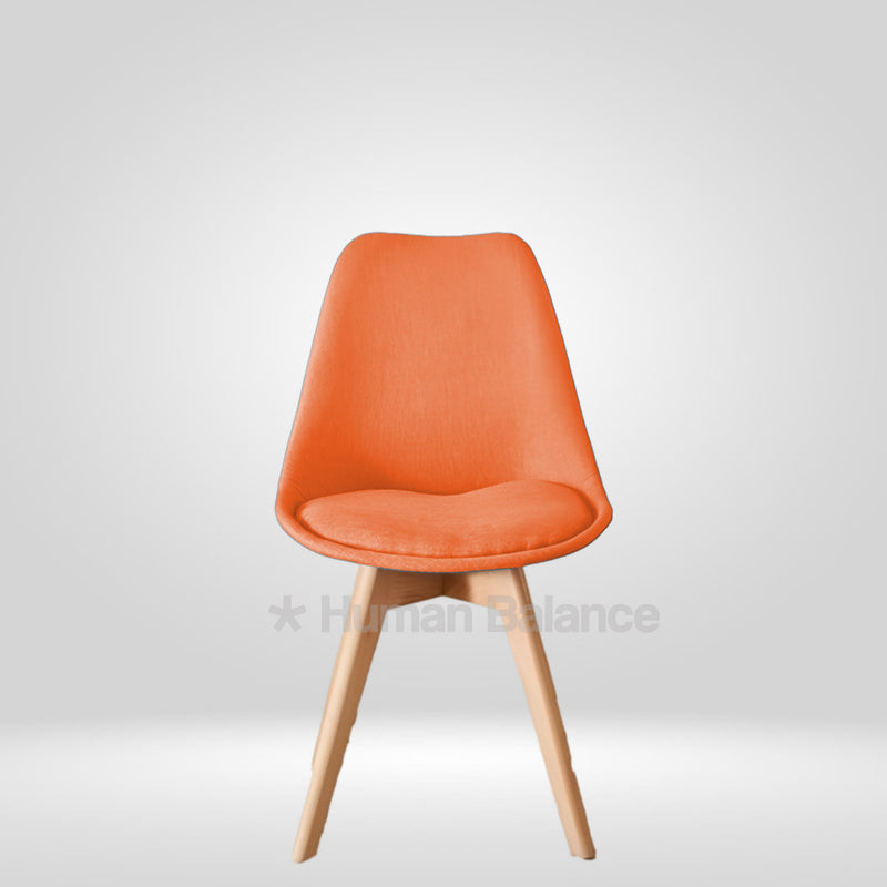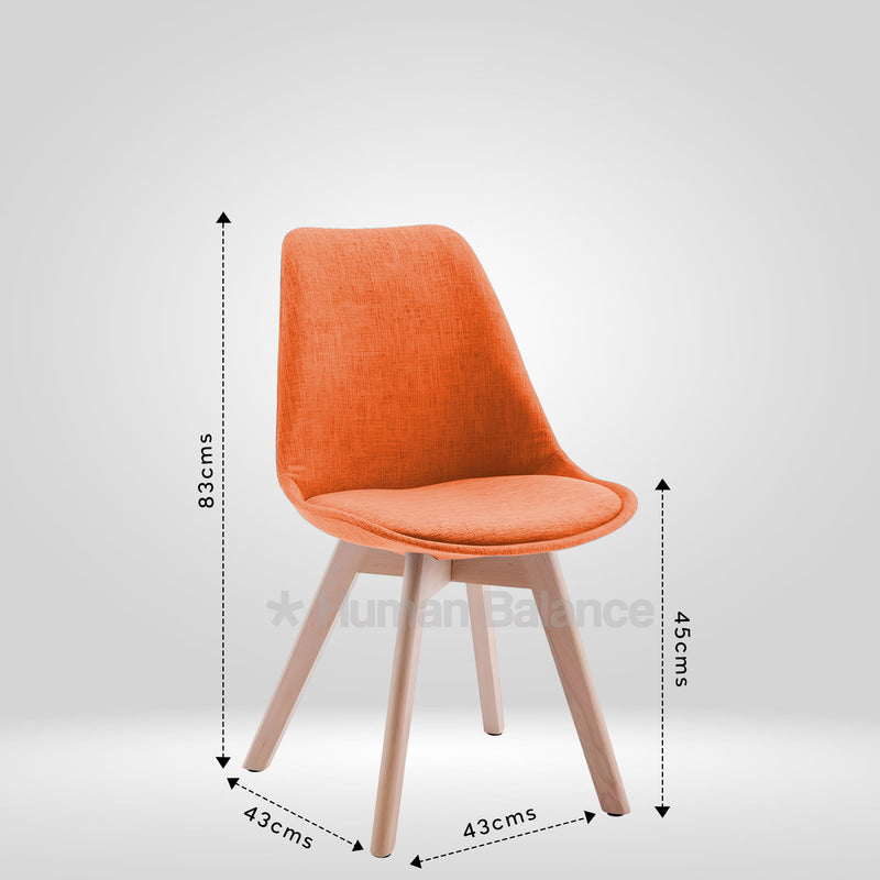 This modern chair is a sleek and practical touch to any contemporary room. Built with high quality single moulded fibre body which combines durability with ergonomic support, the seat is comfortably cushioned and upholstered with a soft fibre fabric offering just the right support for comfortable seating of long periods. This chair adds comfort and sophistication to everyday use. The base is made from solid wood legs in natural finish. A perfect combination of comfort, strength, and style in one compact form. Not only are these strong legs going to last forever, they also provide an excellent contrast against the smooth seat making the chair look stable and well rounded. The angle cut of the legs is inspired by mid century looks exuding a Scandinavian vibe. This chair, available in a variety of beautiful shades is perfect for a range of interiors like warm café nooks, restaurants, diners and lounges. The seat height of the chair is 18 inches ideal for 30 inch tabletops.