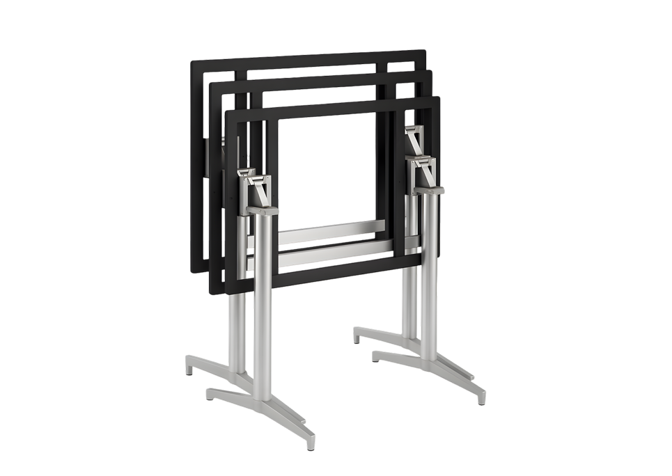 Vertical stacking enables multiple tables to nest closely together minimizing the floor space required during storage.