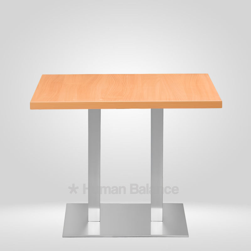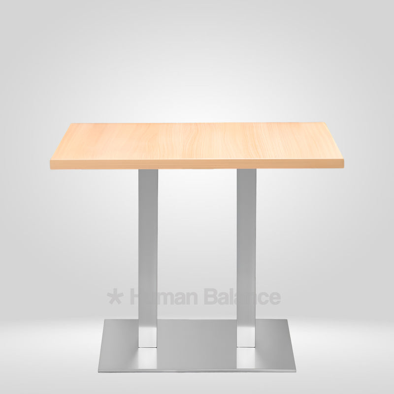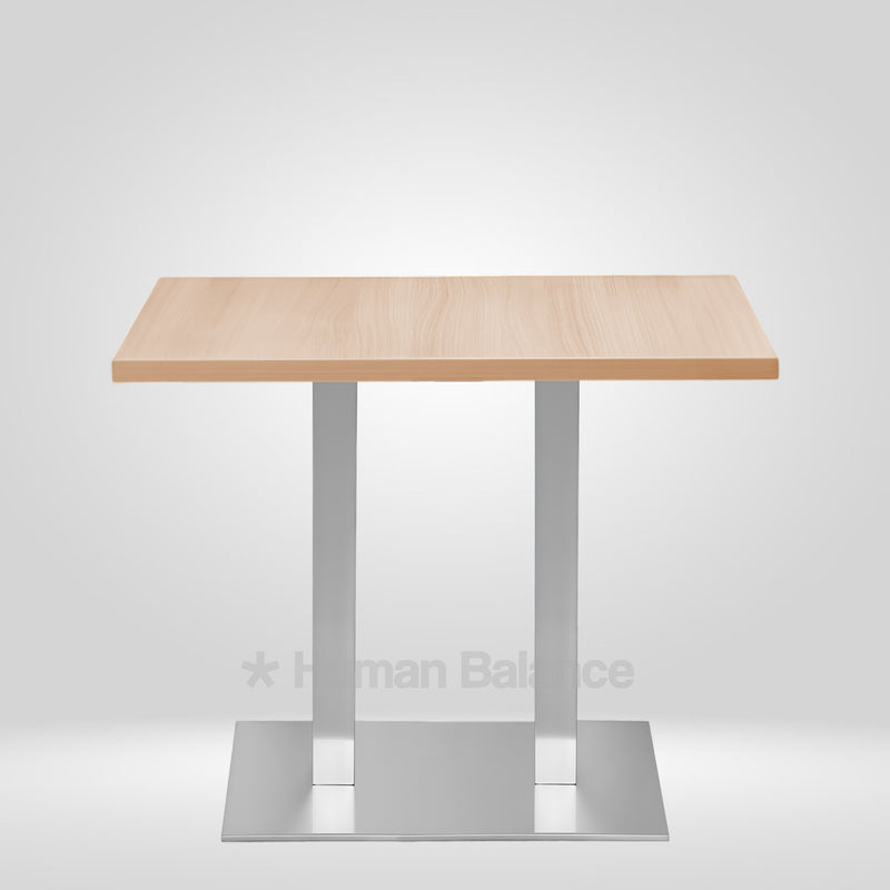 The Standor cafe table presents a strong linear composition defined by its dual support frame and clean rectangular top. Its flat metal structure enhances stability while complementing the visual heft of the wooden surface. The clear cut form lends itself to everyday utility with its solid grounded character emphasizing functional strength through minimal elements.