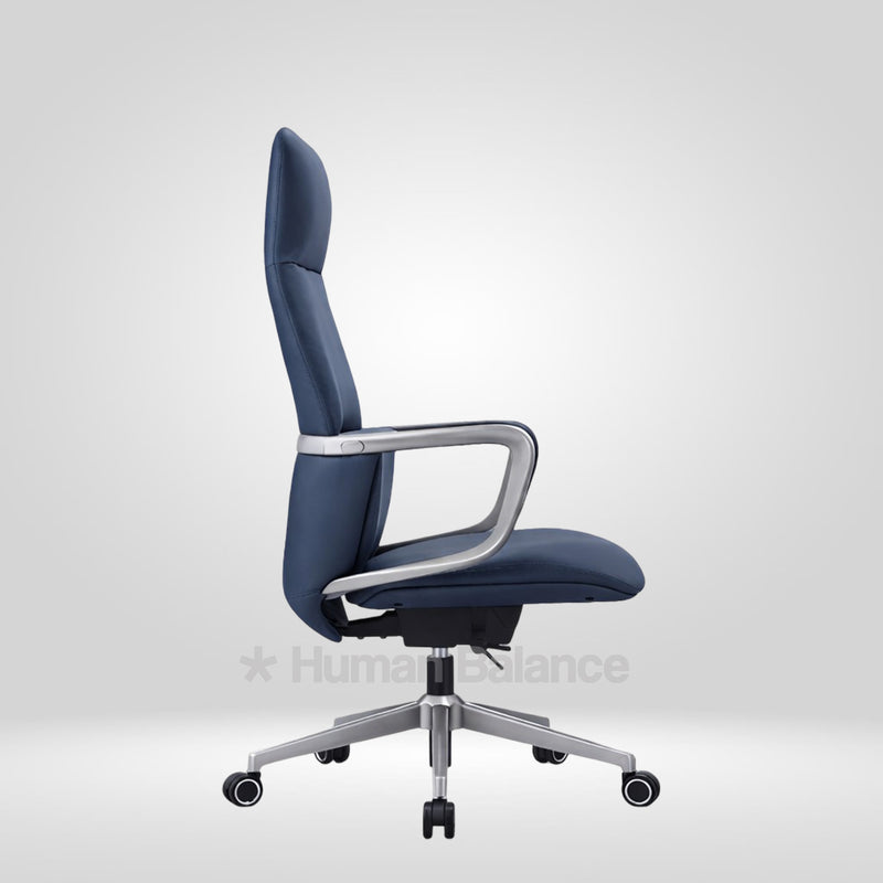 The Versonese highback possesses a strong and confident stance. It supports the upper and middle back and provides firm and steady comfort. The smooth blue finish of the upholstery complements the silver frame which imbues a hint of sophisticated professionalism to the overall design. Such an exquisite design gives the sitter a feel of power and authority which makes it go really well with midcentury modern style interior decor.