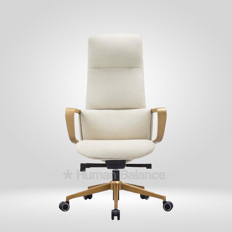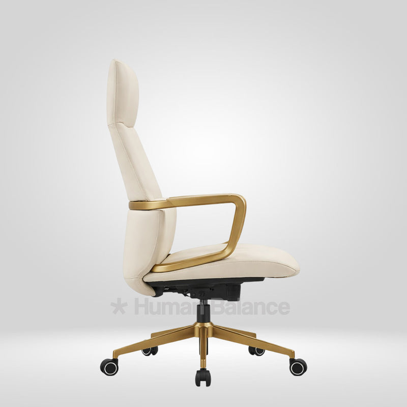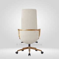 The Titanor highback possesses a strong and confident stance. It supports the upper and middle back and provides firm and steady comfort. The smooth white finish of the upholstery complements the gold frame which imbues a hint of elegant professionalism to the overall design. Such an exquisite design gives the sitter a feel of power and authority which makes it go really well with contemporary style interior decor.