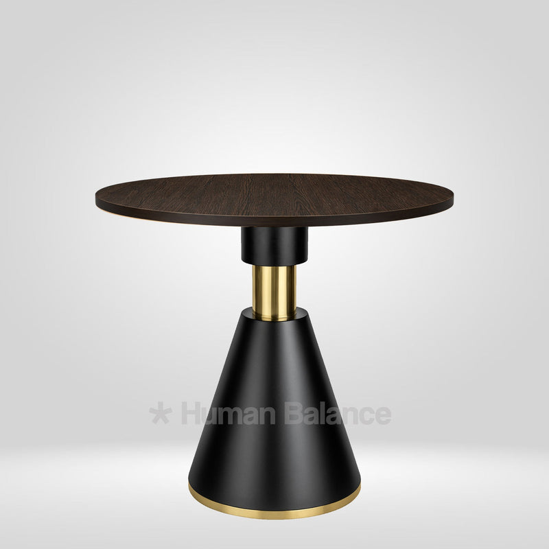 The Vulpecula cafe table depicts a luxurious sculptural minimalism with its conical pedestal base. It displays dual tone sensibility with its dark tones embellished by sophisticated gold accents. Such a dynamic interplay gives the entire profile an elegant stance. The black gold luxe finishing reflects 1950-60s "eleganza funzionale" Italian furniture design sensibility. This design gels perfectly with midcentury European style interiors.