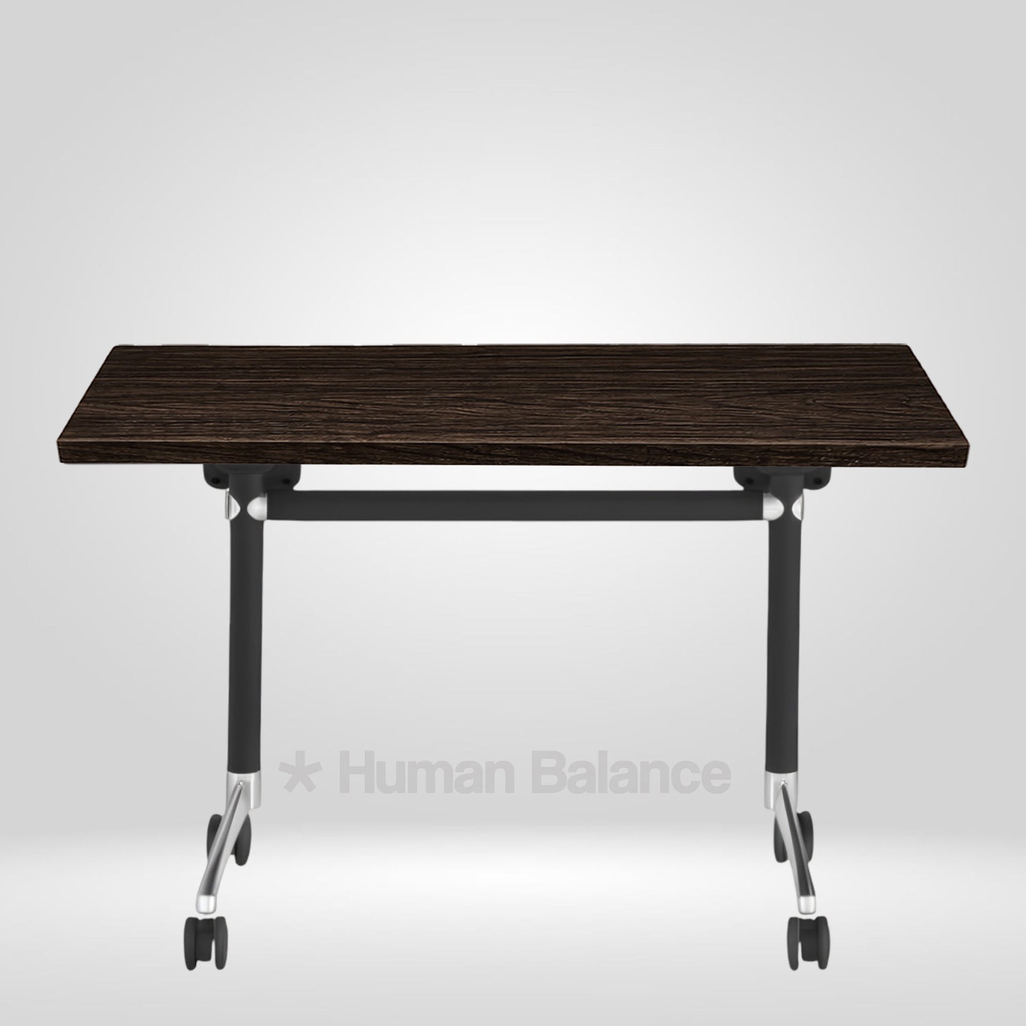 The Wikson cafe table portrays classy and modern design in its two tone base from sleek silver to bold black legs in a striking modern design. Clean lines and balanced proportions accentuate its polished aesthetic. Beyond being stylish, the table is practically easy to use, thanks to castor wheels that roll smoothly and a convenient folding mechanism for easy mobility, compact storage and flexible arrangement in dynamic settings.