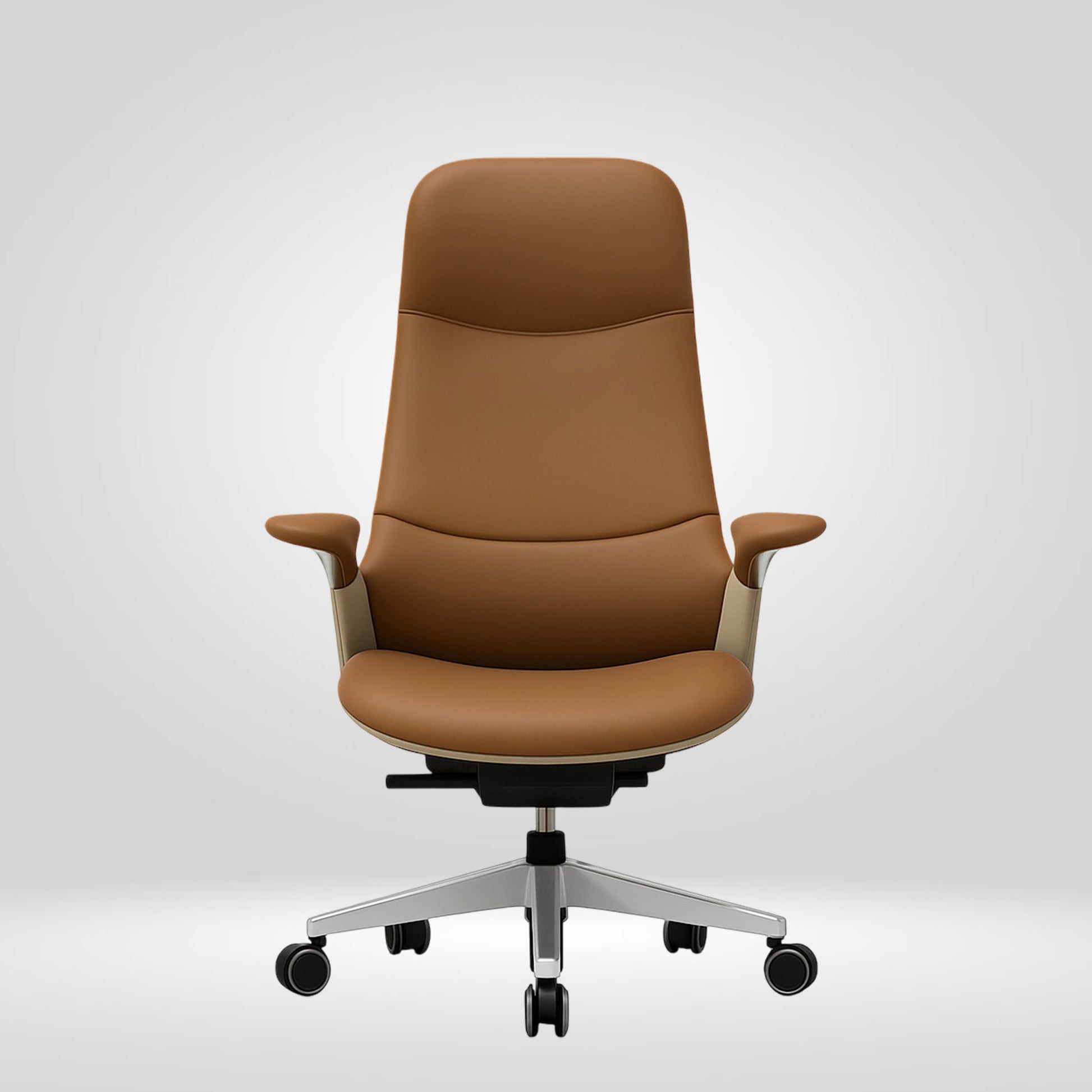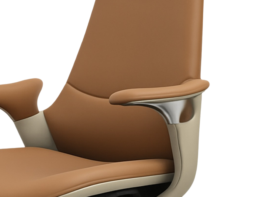 The armrests rise in a crisp tapered line that flows directly from the back, offering subtle forearm support while maintaining sleek architectural precision.