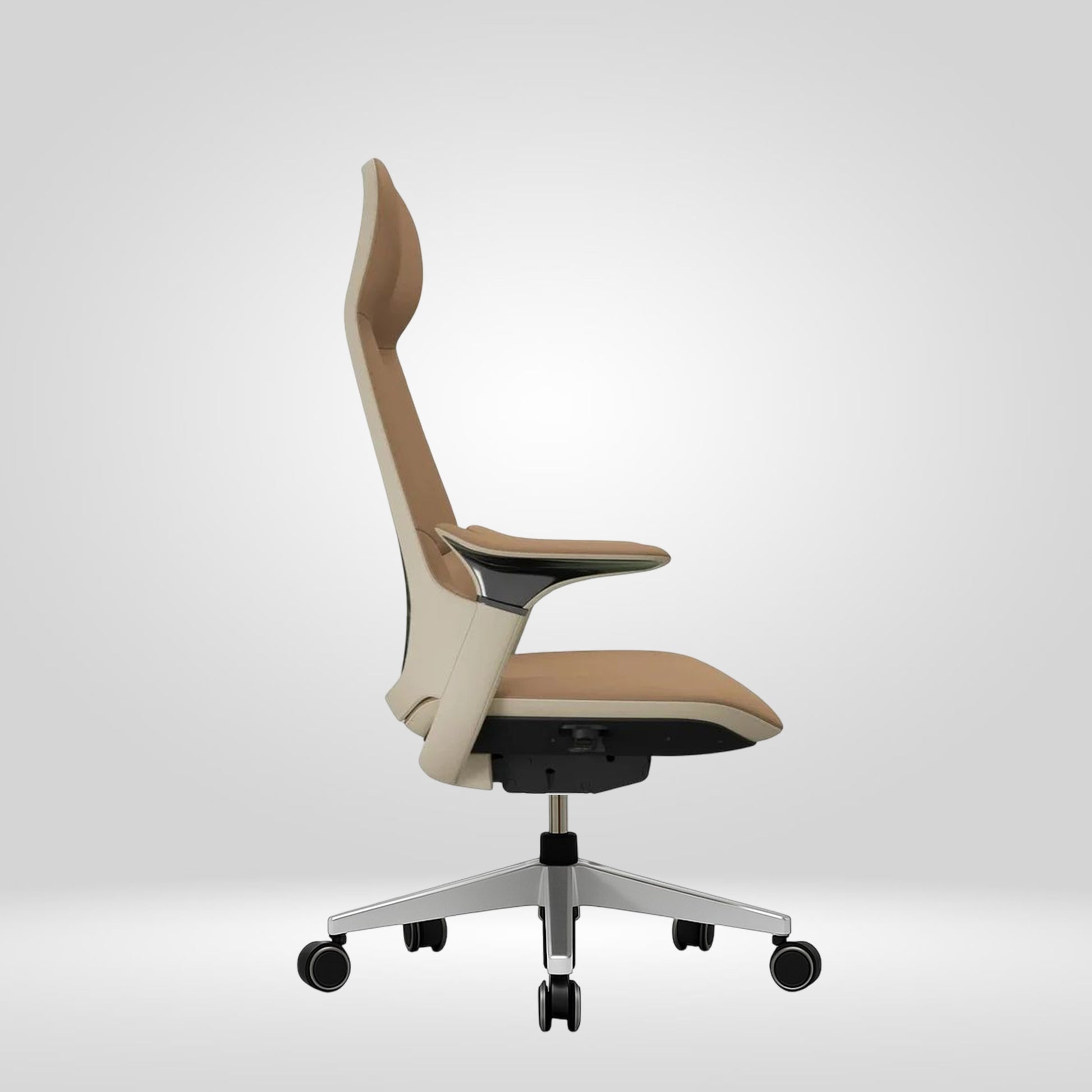 The chair’s profile subtly tapers upward, creating a visually slimming effect that reduces bulk and heightens the sense of refinement.